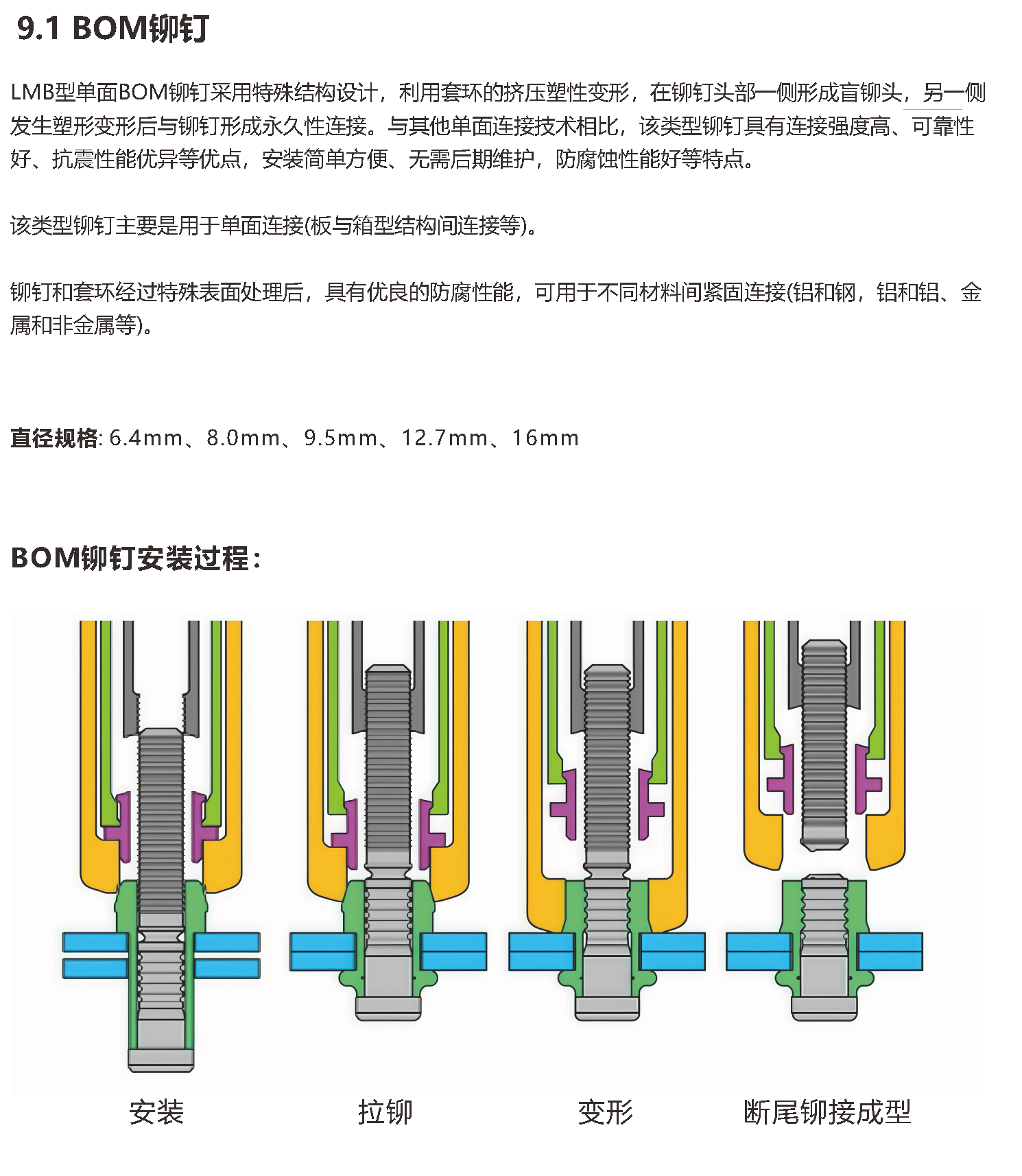 从技术上来说,抽芯铆钉由两部分组成:铆体和钉芯。抽芯铆接的特殊之处在于只需在连接件的一侧进行施工即可,而螺钉连接、敲击和冲压铆接等,必须同时对连接件的两侧进行施