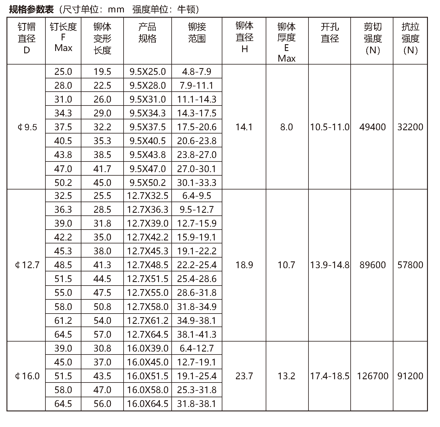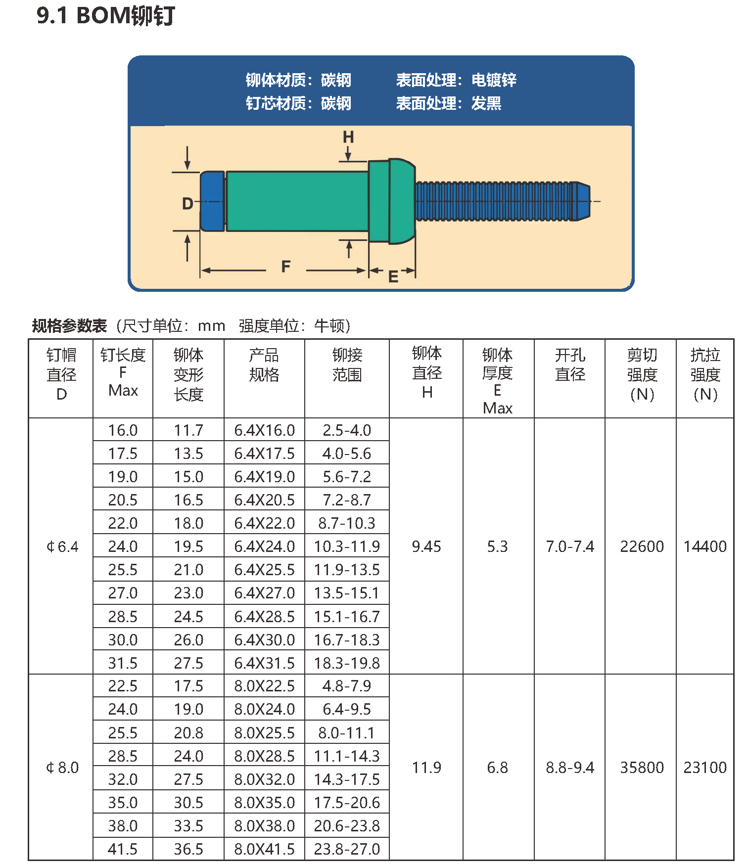 抽芯铆钉可提供不同的设计、材料、形式、长度和颜色。根据抽芯铆钉的应用,可选择现货供应的标准件,也可选择专为特定应用开发的特殊设计的抽芯铆钉。