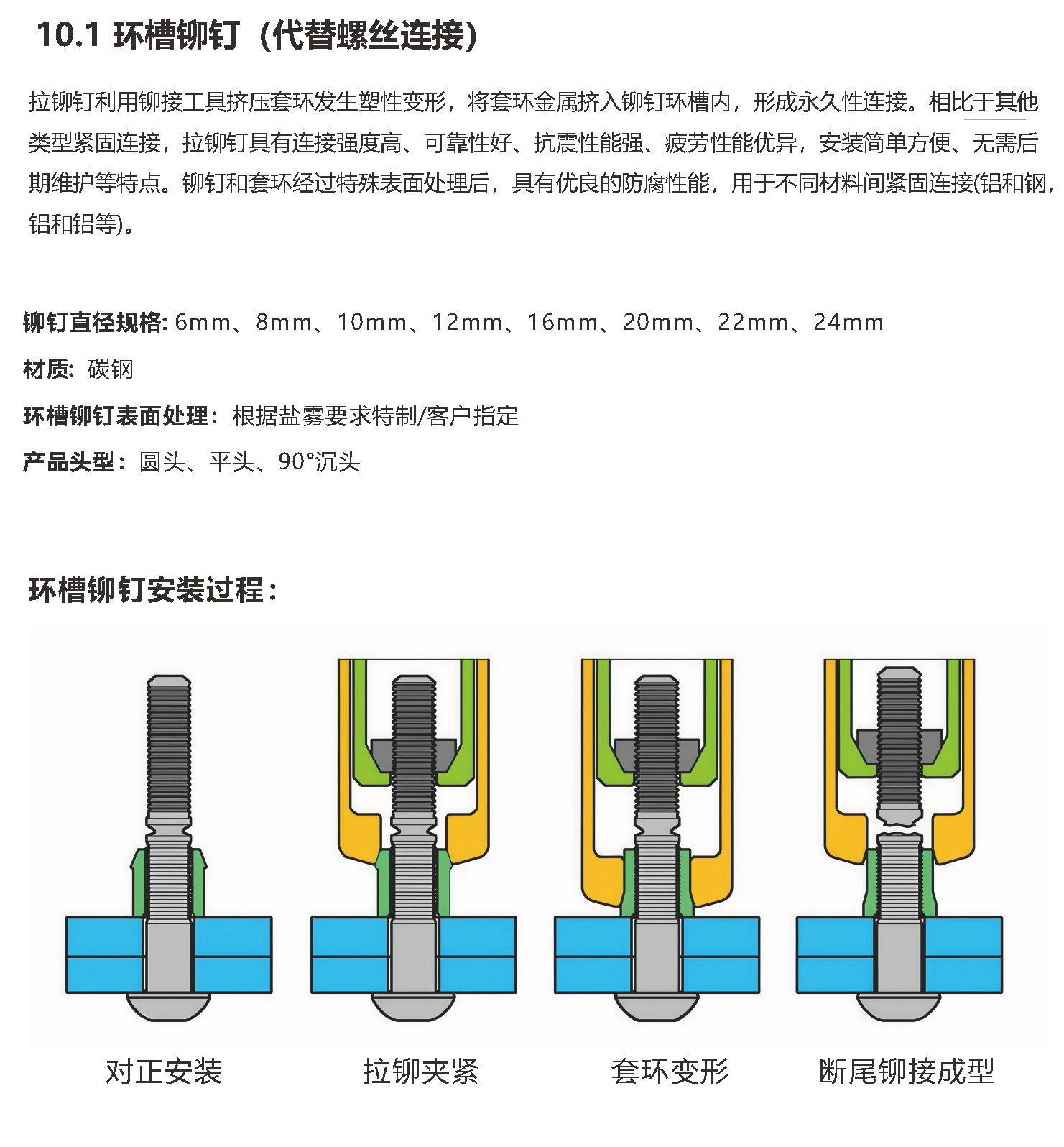从技术上来说,抽芯铆钉由两部分组成:铆体和钉芯。抽芯铆接的特殊之处在于只需在连接件的一侧进行施工即可,而螺钉连接、敲击和冲压铆接等,必须同时对连接件的两侧进行施
